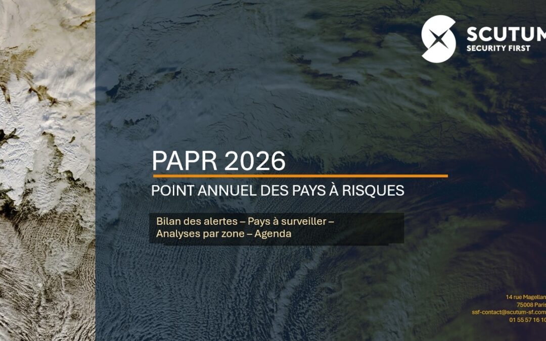 Scutum Security First (SSF) a le plaisir de vous partager son Point annuel des pays à risques 2026 (PAPR), conçu pour aider vos équipes à anticiper, prioriser et adapter leurs dispositifs de sûreté à l’international.